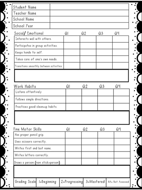 Keep It Developmentally Appropriate Preschoolers develop at different rates. A scale like “Beginning, Progressing, Mastered” (instead of letter grades) gives a clearer picture of growth without pressure. We always explain to our parents that it's common and appropriate to see lots of "Beginning" or "Progressing" on preschool report cards as the children are new to being students and learning these skills.